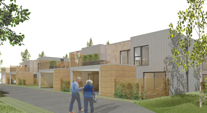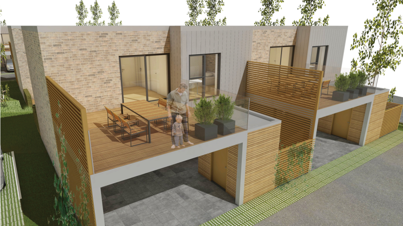 Boligerne udføres som række boliger opdelt i 3 enheder med god plads til parkeringsarealer og grønt område.