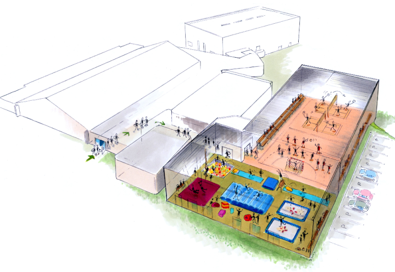 Springhallen er udstyret med en komplet springgravsløsning fra PE Redskaber i den ene ende af hallen, hvilket giver mulighed for et bredt udvalg af gymnastik- og springaktiviteter.