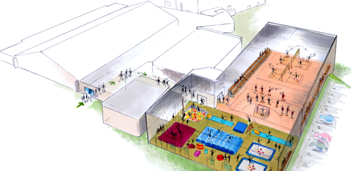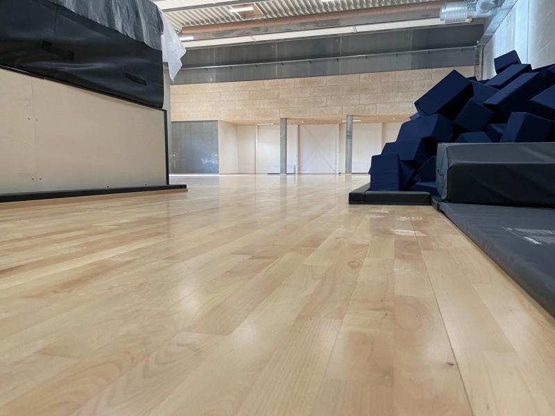 De to haller har et markant, råt udtryk med betonelementer og en imponerende lofthøjde på 7 meter, hvilket giver en åben og rummelig atmosfære. Sportsgulvene er designet med henblik på høj funktionalitet, og de lydabsorberende vægge i lys træbeton sikrer et behageligt akustisk miljø.
