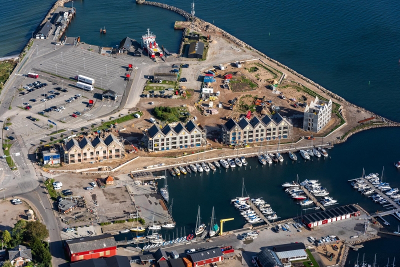 Som totalentreprenør har vi forestået opførelsen af boligprojektet Færgebyen, der består af moderne boliger og erhverv i første række til vandet på Hou Havn, samt en 550 m lang in situ støbt beton kystsikringsmur. Byggeriet er opført som et klassisk bådhusmotiv med sadeltag i materialer og stil, der harmonerer med byens og havnens eksisterende udtryk. Der er lagt vægt på arkitektonisk integration i det eksisterende bymiljø. Byggeriet udmærker sig også med sin landskabs arkitektoniske integration af de omkringliggende arealer, med beplantninger der taler ind i det maritime miljø. Der er er ifm. Med byggeriet også opført en erhvervsbygning med Restaurant/deli, med storkøkken, køle/fryserum og bar faciliteter inkl. Alle tekniske installationer.