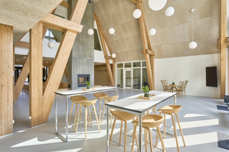 Selvom lovkravet er et LCA-aftryk på max 12 kg CO2-ækv./m2/år, sigter bygherre efter ca. 8. Det er opnået med bl.a. synlige limtræskonstruktioner og træfacader – resultatet blev 7,9 kg.