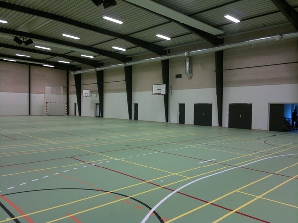 Taget opbygges med hvide perf. ståltrapzplader med tagpap. Gulv opbygges med undergulv i beton og derpå fjedrende sportsgulv.