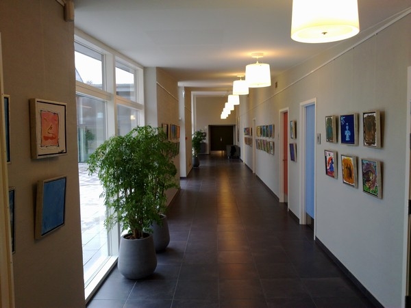Indvendigt er væggene vandskuret og malet i lyse nuancer med et flot farve spil.Lofter er varierende i såvel overflader som udtryk skrånende- og vandrette.