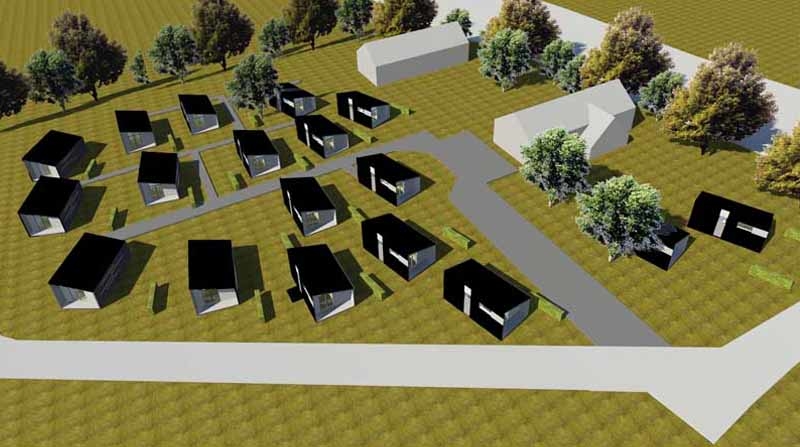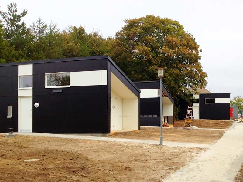 Klyngehusene omfatter 18 fritliggende boliger, opbygget af præfabrikerede, lette væg- og tagelementer beklædt med sorte og hvide cementbaserede plader, samt sorte tagpaptage.