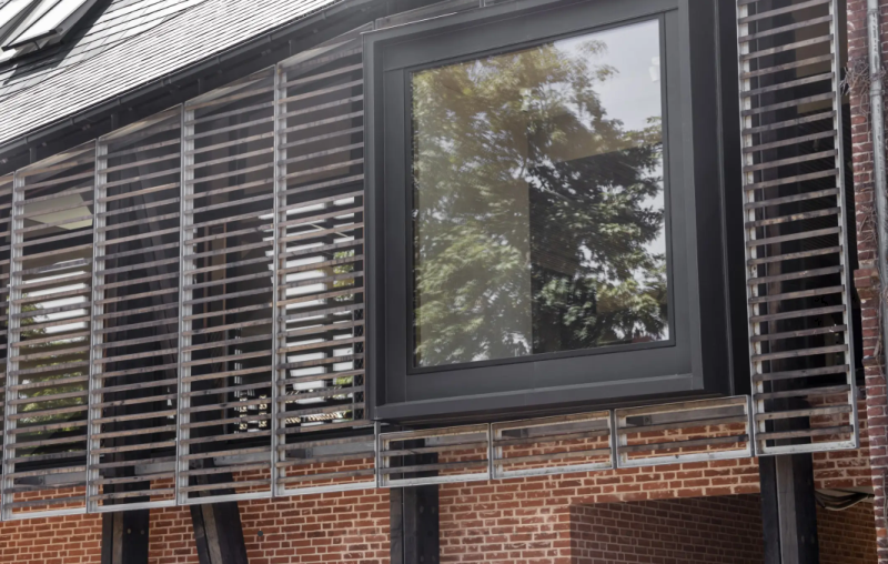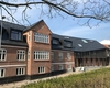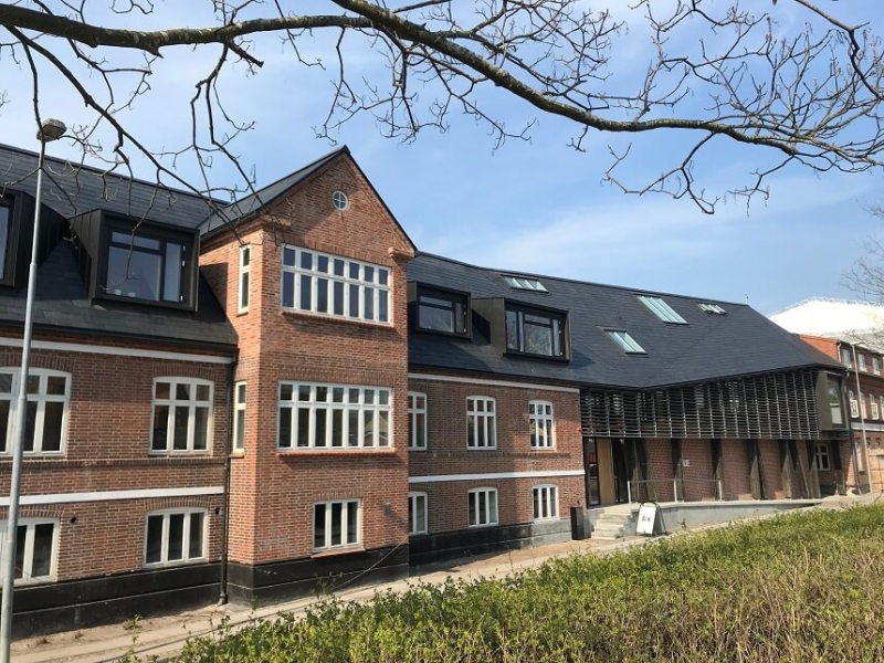 Den nye bygning med den nye hoveindgang tog form mellem to gamle huse, og taget i naturskifer blev et centralt element, der tilførte en visuel helhed. Skifertaget former sig således efter de to huses gavle og skaber et sammenhængende tagforløb over bygningerne.
