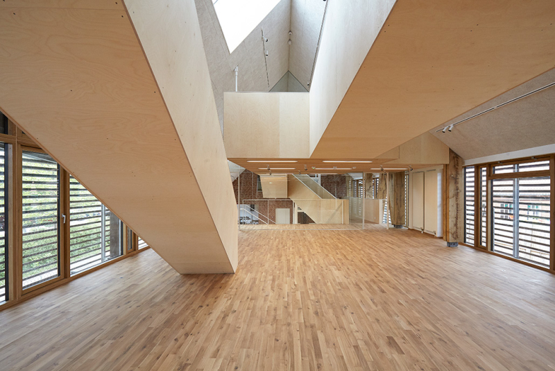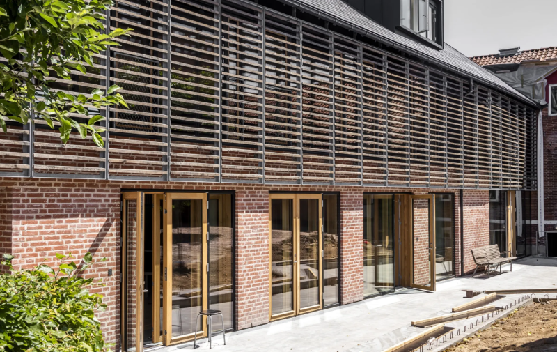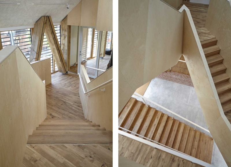 De gamle bygninger lå ikke på linje, og højden og geometrien var ikke ens, derfor blev taget trekantet og skabte hermed en ekstraordinær overflade, som blev videreført og fortsatte til alle bygningerne, hvilket skabte et stærkt bånd, der afspejler den indre forbindelse og det indre liv.